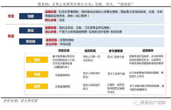 中国实行土地两权分离制度,土地所有权公有,使用权可转让。转让方式包括有偿出让和无偿划拨两大类,分别主要针对经营性用地和基础设施用地。2002年国土资源部11号令出台后,“招拍挂”成为土地有偿出让的主要方式,2006-2016年招拍挂出让土地占总出让土地面积的81.5%。招拍挂相比协议出让更公开透明,但以“价高者得”为原则,客观上也推升地价、助推房价上涨。