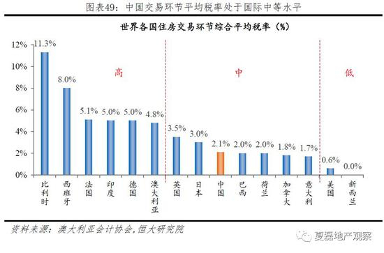 交易环节税种税率较高,但由于免征条件多,总体来看居民在交易环节的税收负担处于国际中等水平。根据澳大利亚会计协会统计,中国住房交易环节综合平均税率2.1%,处国际中等水平。