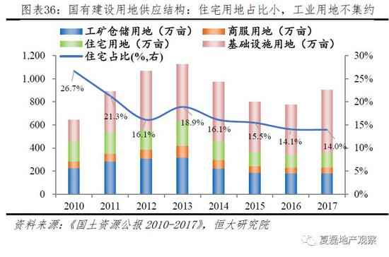 农地征收垄断、分税制改革、土地出让收入由地方支配、GDP锦标赛、快速城镇化,衍生出土地财政。2018年全国土地出让收入6.5万亿、房地产相关税收2.7万亿(估算),二者共占地方综合财力的35.4%。此外,地方土地抵押融资超过10万亿。土地财政是“双刃剑”,在调动地方积极性、推动城市建设、促进经济增长的同时,也助推地价房价上涨。地方政府为实现土地出让金最大化,压缩住宅用地供给,2010-2017年,住宅用地供应仅占总建设用地供应的17.8%,仅为工业用地的65.6%。住宅用地稀缺推高地价。