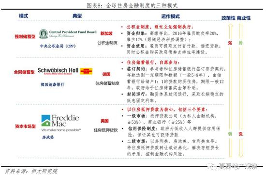 全球的住房金融制度有三种模式:强制储蓄型、合同储蓄型、资本市场型,三者的政策性依次减弱、商业性依次增强。