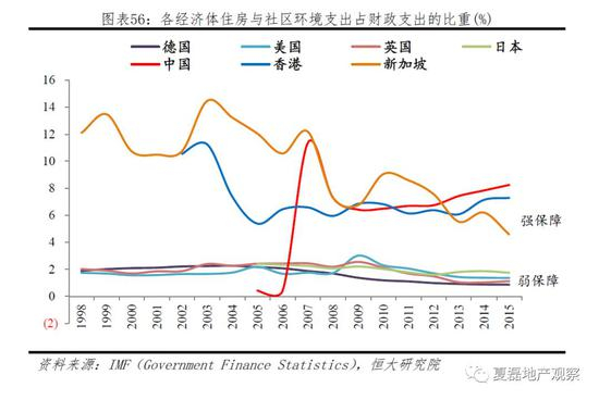 中国住房保障以直接支持模式为主,政府是建设主体。按2007年后的保障房供给量来看,属于“强保障”经济体。按照IMF口径,2015年中国住房与社区环境支出占财政支出的8.2%,高于香港、新加坡,保障力度较大。