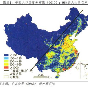 中国,国土面积居世界第三位、占世界陆地总面积的1/15,但平原和盆地仅占陆地面积的33%,山地、高原、丘陵占67% 。人口高度集中在东南部,以胡焕庸线(黑河-腾冲线 )为界,全国94%的人口生活在东南43%的土地上,而西北57%的土地,分布着戈壁、沙漠、高原,仅6%的人在此居住 。