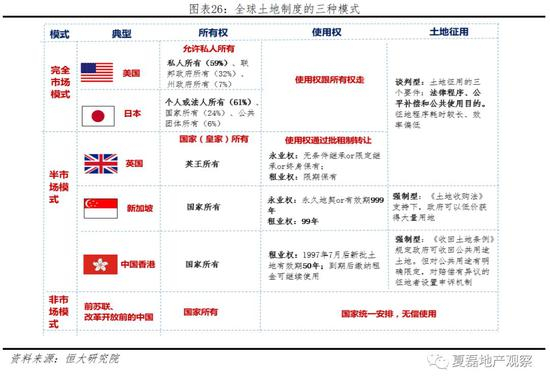 从土地所有权的角度,全球土地制度有完全市场、半市场、非市场三种模式。完全市场模式,允许私人拥有土地所有权,如美国、日本等;半市场模式,所有权归国家(皇室)所有、使用权可有偿转让,即“两权分离”,以英国、英联邦国家为代表;非市场模式,土地所有权、使用权都由国家控制,如前苏联和改革开放前的中国。