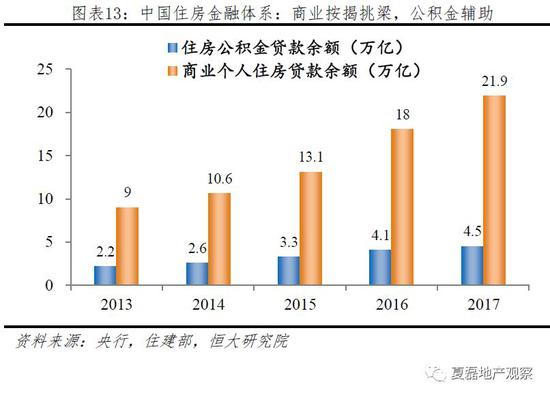 中国的住房金融体系由商业按揭贷款和公积金构成,前者主导。2017年,商业个人住房贷款余额21.9万亿,占全部个人住房贷款余额的82.9%。
