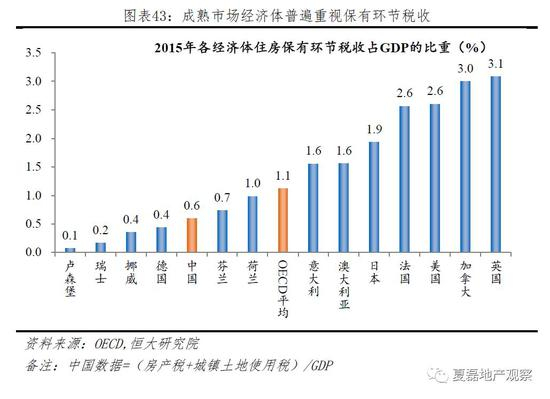 发达国家住房税收体系,有“重保有、宽税基、简税种、低税率”四大特点。一是普遍重视保有环节税收,根据OECD的统计,2015年OECD国家保有环节税收占GDP比重为1.1%(中国为0.6%),其中英国、加拿大、美国分别高达3.1%、3%和2.6%;二是宽税基:对大多数房产拥有者征税,仅对公共、宗教、慈善机构等少数免税;三是简税种:税种不多,大多数只开征了财产税、所得税、转让税等几个税种;四是低税率:主体税种税率一般较低,从而降低居民税收负担和征管阻力,但宽税基、高征管效率下,仍然可为政府提供充足收入。