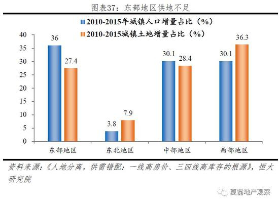 1998年修订的《土地管理法》宣布实行耕地占补平衡制度,并长期禁止跨省占补。尽管2017年《关于加强耕地保护和改进占补平衡的意见》提出“以县域自行平衡为主、省域内调剂为辅、国家适度统筹为补充”的占补原则,允许重点扶贫地区补充耕地指标向发达地区调剂,但县市仍然是耕地占补平衡的主要范围。耕地后备资源不足的东部省份难以获得足够的建设用地指标,2010-2015东部地区人口增量占比36%,高于城镇建设用地增量占比8.6个点,但东北、西部人口增量占比低于城镇建设用地占比达1.7、6.2个百分点。
