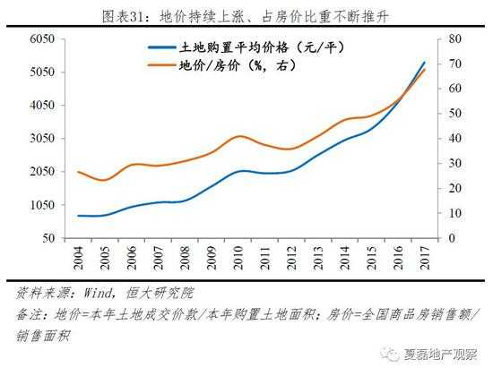 推高地价和房价。一方面,土地招拍挂制度以价高者得为原则,虽公开透明,却也不断推升地价、产生地王、助推房价上涨;另一方面,土地资源错配,如城市建设用地中居住用地占比低、大城市要人不供地,推升地价。2004-2017年,全国土地购置均价由722元/平方米上涨至5349元/平米,年复合增速16.7%,地价占房价的比重由26.6%上升至67.8%。