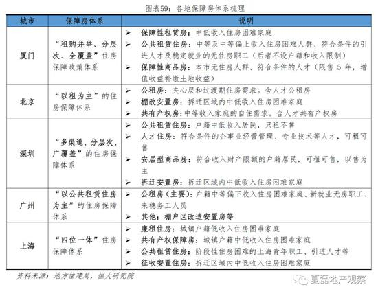 中国的住房保障体系包括公租房、经济适用房、棚户区改造安置房等多种类型。各地保障房体系各有特色。如厦门特色为“租购并举”,提供保障性租赁房、公租房和保障性商品房三类保障房;广州特色为“以租为主”,公租房是最主要的保障房品种;上海特色为“四位一体”,廉租房、共有产权房、公租房、征收安置住房四类保障房并行。