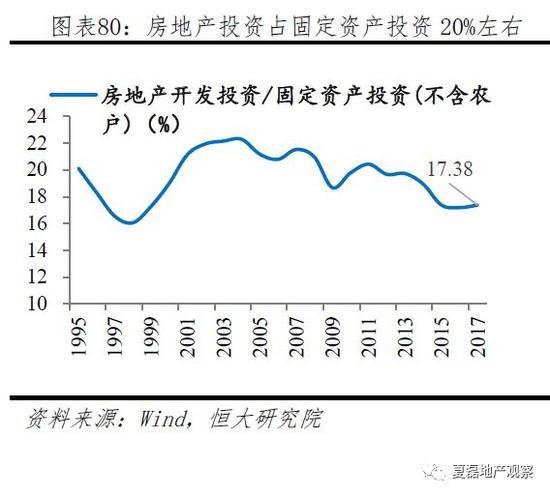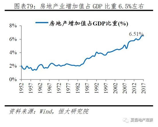房地产是支柱产业,1998年以来房地产增加值占GDP的比重不断创新高,从1998年的4.0%增加至2017年的6.5%;房地产开发投资占固定资产投资的比重2000年以来保持在20%左右,2017年为17.4%。房地产还带动了众多上下游产业。按照申万一级行业分类, 全部28个行业中14个行业受房地产带动。根据原国家统计局副局长许宪春(2015)基于投入产出表的测算 ,2013年房地产贡献相关产业增加值占GDP的9.0%。