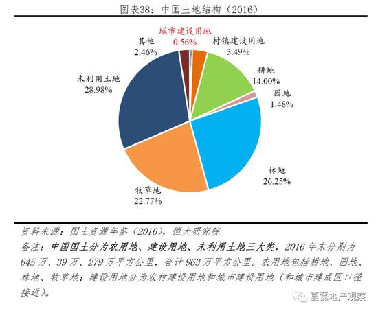占国土面积4.1%的建设用地中,城市建设用地仅占七分之一。中国城市建设用地占国土面积的0.56%,远低于发达国家,如美国、日本、英国达到1.6%、2.8%、5.6%。2010-2016年,在农村人口减少8140万人的情况下,农村建设用地反而增加了990万亩,直接原因是农民工群体在城镇和乡村“双重占地”,形成众多“空心村”。在北京,2015年农村建设用地高达1174平方公里,相当于城镇建设用地的70.5%;在上海,农村建设用地为819平方公里,相当于城镇建设用地的40.4%。(参考报告《人地分离,供需错配:一线高房价、三四线高库存的根源》)。