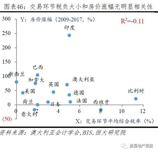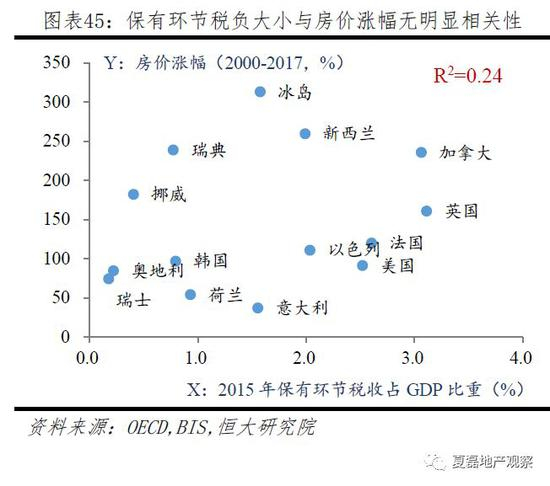税收制度调节房价作用不明显。由于税收具有转嫁效应,在人口流入、产业发展好的地区,市场需求旺盛,住房税收可转嫁给需求方,对房价影响不大。14个样本国家,长周期(10-20年)内,房价涨幅和保有或交易环节税负大小无明显线性关系。