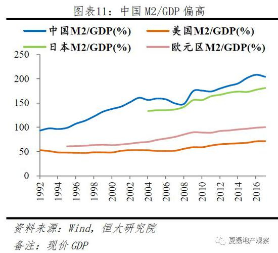 中国过去20年经济发展和货币发行不同步。1998-2017年,M2从10万亿增至169万亿,上涨16倍,而同期名义GDP、城镇人均可支配收入仅上涨9倍、6倍。2017年中国M2/名义GDP为204%,高于美国、日本、欧洲。