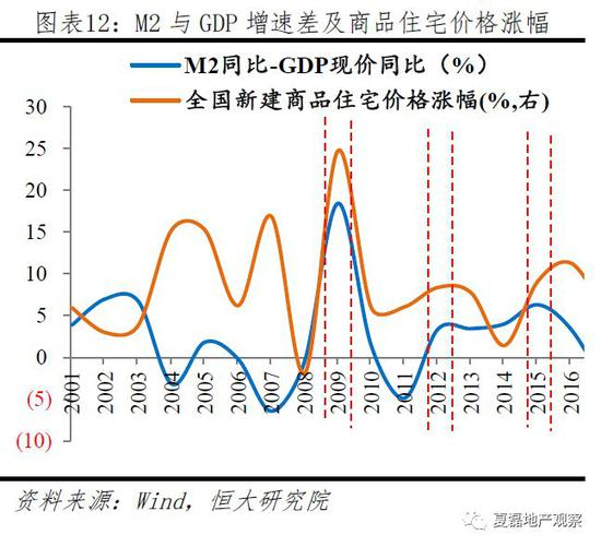 房地产是货币的蓄水池。根据货币数量方程MV=PQ,若货币供应增速持续超过名义GDP增速(生产活动所需要的资金融通),资产价格上涨。商品房具有很强的保值增值金融属性,是货币的重要蓄水池。如2009年、2012年、2015年,“M2增速-名义GDP增速”与全国新建商品住宅价格涨幅走势一致。