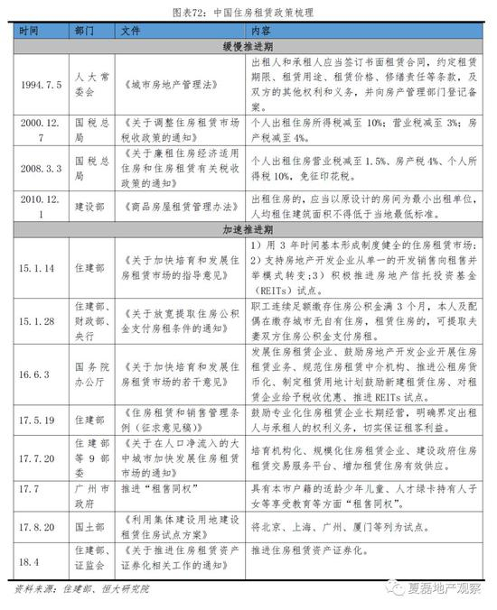 2015年以来租赁制度大获推进。住建部等部委相继出台《关于加快培育和发展住房租赁市场的指导意见》(2015年1月)、《关于在人口净流入的大中城市加快发展住房租赁市场的通知》(2017年7月)、《利用集体建设用地建设租赁住房试点方案》(2017年8月)等,从租赁用地供给、培育专业化住房租赁企业、支持租赁融资、推进租购同权等方面推动租售并举。