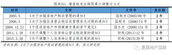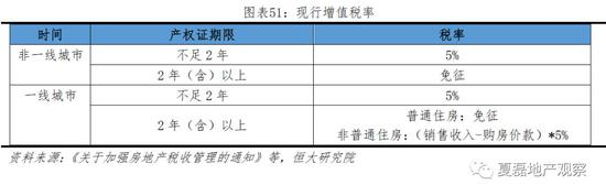 ② 增值税及附加:购买满2年出售免征。根据《关于调整个人住房转让营业税政策的通知》(财税(2015)39号),个人将购买不足2年的住宅对外出售,全额征收增值税,税率为5%,税基为销售收入与购房价款之差。增值税免征期限是常用的财税调控工具,2005-2018年累计调整过5次,在2年和5年间变动。