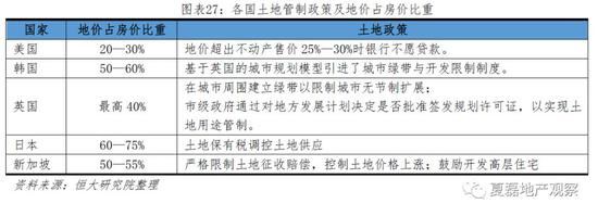 从土地管理的角度,各国通过土地征用、土地用途管制、城市规划、税收政策等影响土地供给,一定程度影响地价和房价。例如韩国和英国建立绿带限制城市扩张,加剧土地稀缺并推升地价;美国银行在地价超出不动产总售价25%-30%时不发放开发贷,有效控制地价占房价的比重;日本在房价泡沫期间加征土地保有税,激活土地供给,控制地价涨幅。