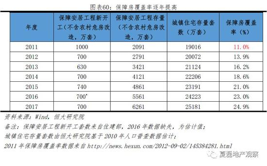 近十年,我国在住房保障上投入了大量资金,估算当前保障房覆盖率达24.9%。根据2011年时任总理温家宝在天津视察时提到的数据,2008年我国城镇保障房覆盖率尚不足4%,2011年达到11%。结合我们对城镇住宅存量的估算(参见报告《中国住房过剩还是短缺?》),推知2011年保障房存量为2091万套,而2012-2017年间保障安居工程累计开工4170万套,估计当前保障房存量为6261万套,占城镇住宅存量的24.9%。