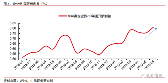 受包商事件影响,工业企业的融资成本的被动升高可能是费用反弹的原因之一。2019年5月24日,银保监会发布公告称,鉴于包商银行出现严重信用风险,为保护存款人和其他客户合法权益,对包商银行实行接管。随着市场避险情绪逐渐提升,银行间市场对质押券的资质要求也愈发严格,低等级的民企债券作为质押品的融资渠道受阻,间接提高了民营企业的融资难度。企业债与国开债的利差有所走扩说明民营企业融资成本仍在抬升,这可能是工业企业费用的反弹原因之一。