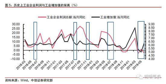 工业增加值与工业企业利润的走势较为一致,但二者的短暂背离也时有发生。理论上,盈利的改善将提升企业的投产意愿,相应的,利润增速下滑也会对企业扩产形成一定的制约,因此,从长期来看,企业的生产增速与利润增速往往有一定的联动性。从历史经验上看也的确如此,自2016年至今,工业增加值与工业企业利润确实存在着较为稳定的联动关系。然而,生产与销售(盈利)是企业经营活动中的两个不同环节,受企业主观意愿、政策调控、市场环境等等因素的影响,生产与销售可能会出现短暂的背离。自2016年至今,工业增加值当月同比增速与工业企业利润当月同比增速的背离共发生过五次,分别为2016年7月、2017年8月、2017年12月、2018年7-8月和2019年5-6月。