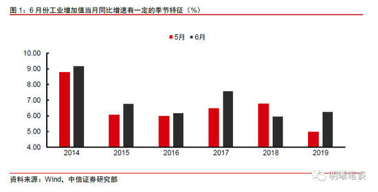 从历史经验看,6月工业增加值当月同比往往存在一定的季节因素。自2014年至2019年,各年份6月工业增加值当月同比较同年5月的变动幅度分别为:0.4%、0.7%、0.2%、1.1%、-0.8%、1.3%,除2018年外,其余年份中各年6月的工业增加值当月同比均高于同年5月,反映出季末的工业生产存在一定的季节特征。另一方面,2018年6月工业增加值当月同比为6.0%,较前值回落6.8%,这种低基数效应也可能是2019年6月工业增加值回升的原因之一,从累计同比来看,6月工业增加值的累计同比与5月持平,说明经济基本面仍在温和走弱。