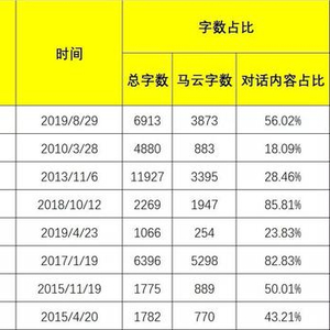 (马云公开“对话”实录字数统计,制表:盒饭财经)