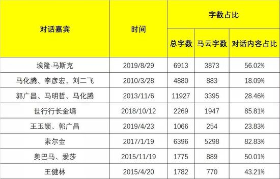 数据显示,埃隆·马斯克对话实录(所有实录字数均除去主持人),共计6913字,其中马云3873个字,占比56.02%;与马化腾、李彦宏、刘二飞这场,共计4880字,其中马云883字,占比18.09%;郭广昌、马明哲、马化腾这场,共计11927字,其中马云3395字,占比28.46%;王玉锁、郭广昌这次,共计1066字,其中马云254字,占比23.83%;奥巴马与爱莎场,共计1775字,其中马云889字,占比50.01%;与王健林的对话,总计1782字,其中马云770字,占比43.21%。