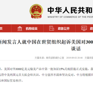 9月1日,美国对华3000亿美元输美产品中第一批加征15%关税措施正式实施。2日,中国商务部表示,将在世贸组织争端解决机制下提起诉讼,根据世贸组织相关规则,坚定维护自身合法权益,坚决捍卫多边贸易体系和国际贸易秩序。