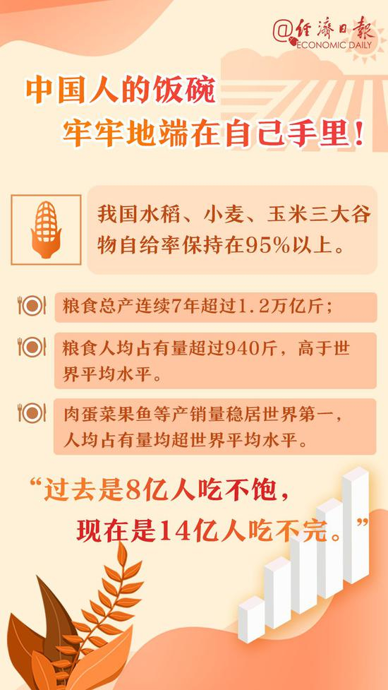 数字最有说服力。目前,我国水稻、小麦、玉米三大谷物自给率保持在95%以上,远远高于布朗预测的42.5%的粮食自给率。粮食总产连续7年超过1.2万亿斤,去年达到13158亿斤;人均占有量超过940斤,高于世界平均水平。农业农村部部长韩长赋深有感触地说,“过去是8亿人吃不饱,现在是14亿人吃不完。”产量连年丰收,质量越来越好、结构更加合理,中国人的饭碗牢牢地端在自己手里。