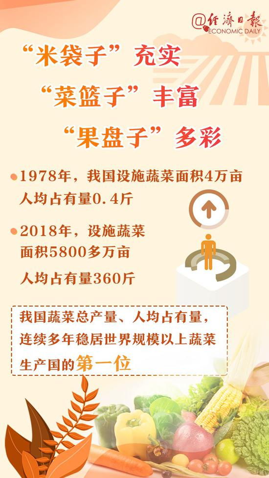 在高精度卫星地图上,可以清晰看到山东寿光每个蔬菜大棚的位置。从小土棚,到下挖式卷帘棚,到无立柱钢结构大棚,再到物联网云棚,当地蔬菜大棚已经发展到了第七代。有了大棚蔬菜,人们享用的蔬菜品种比世界任何地方都要多。数据显示,1978年,我国仅有设施蔬菜面积4万亩、人均占有量0.4斤;2018年,设施蔬菜面积达5800多万亩、人均占有量360斤。我国蔬菜总产量、人均占有量,连续多年稳居世界规模以上蔬菜生产国的第一位。