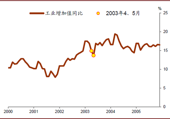 ►工业生产受影响较小,投资、进出口增速波动不明显。2003年4月和5月工业增加值同比增长14.9%和13.7%,低于3月和6月16.9%的增速。进出口和固定资产投资增速本身波动较大,2003年5月前后并没有出现明显下滑。