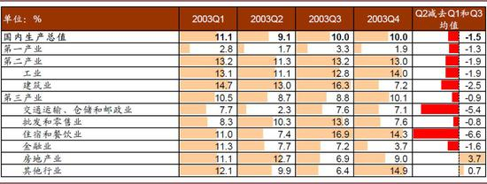 2003年4个季度GDP增速分别为11.1%、9.1%、10%和10%,2季度GDP增速比前后两个季度平均增速低1.5个百分点。
