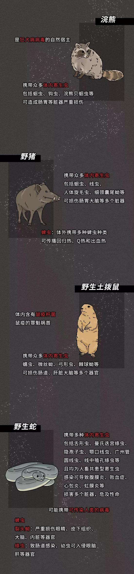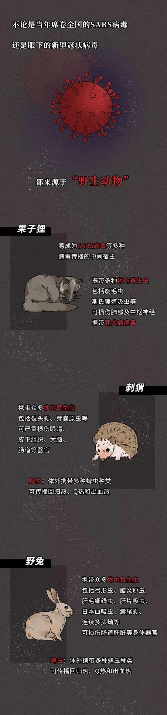 实际上,食用野生动物的风险从未消失,更让人们付出过生命的代价。一场“非典”疫情,让全国人民认识了果子狸。科学研究发现,野生果子狸身上存在狂犬病毒,还有旋毛虫、斯氏狸殖吸虫等寄生虫。可短短十几年时间,人们已将“非典”教训抛诸脑后,新冠肺炎疫情暴发之初,处于新闻风暴眼中的武汉华南海鲜市场曝光的野味店菜单中,果子狸就位列其中,此外还有活杀现宰竹鼠、孔雀、獾等。