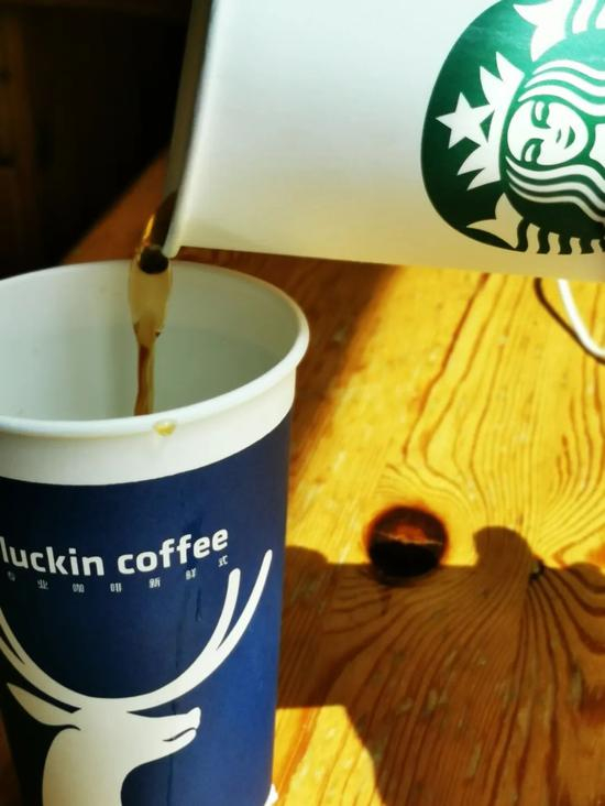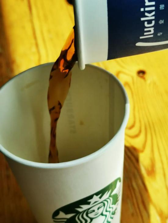 瑞幸版的星巴克做好后,扔掉瑞幸杯子,端着星巴克杯子回家。