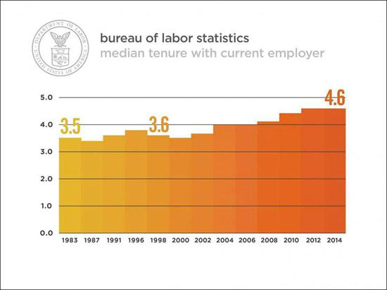 单位工作的时长从1983年的3.5年上升到了2014年的4.6年(数据来源:美国劳工统计局)