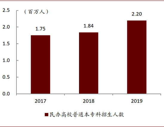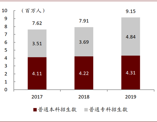 高职院校再度扩招。根据教育部数据,2019年全国普通本专科招生915万人,较上年增加124万人。其中,普通专科(高职)招生484万人,较上年增加115万人,超额完成了2019年政府工作报告提出的当年高职院校“大规模扩招100万”的目标。根据今年政府工作报告目标,今明两年全国高等院校普通本专科招生规模将进一步扩大,平均每年将增加100万人左右。根据教育部数据,2019年民办高等学校普通本专科招生规模同比扩大36万人,占当年整体扩招规模的29%。参考2019年扩招规模,我们预计今明两年民办高等学校普通本专科招生计划将扩大70万人左右,高职扩招将进一步利好办学质量领先、应用型教育实践经验丰富的高教集团。