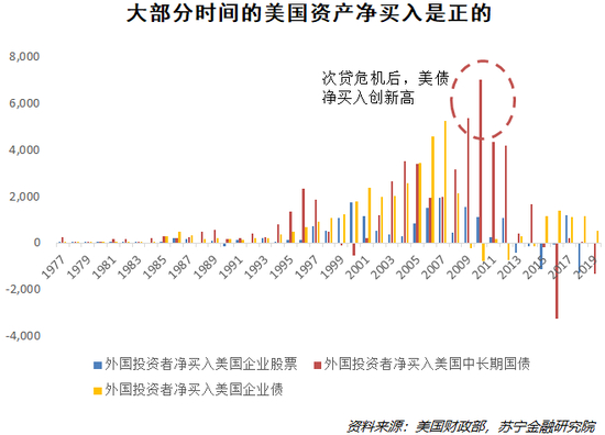 (1)以长期国债为代表的政府和企业债券,相当于全世界借钱给美国。美元始终是全球最重要的外汇储备币种,这些美元储备中的很大一部分转化成了美国长期国债。这也是美国能够在财政出现长期赤字的情况下,美元仍然没有出现明显贬值的原因。尤其是次贷危机后,美国长期国债净买入创新高,再次印证了美债的避险功能。