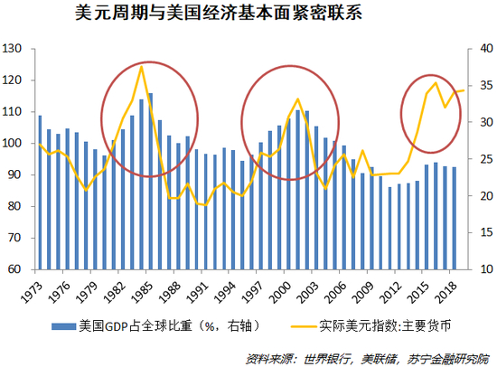 20世纪70年代布雷顿森林体系解体之后,美元与黄金脱钩,世界货币体系开始向多极化发展。美元指数至今的三轮强周期(1975-1982年、1995-2002年、2011-2019年),均伴随着美国GDP占全球比重的明显提升,背后则是相对于其他经济体的强势复苏。
