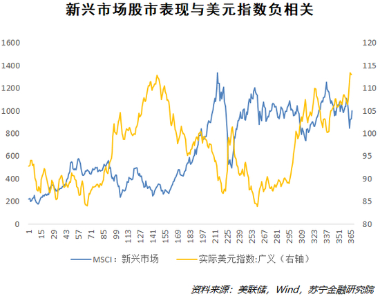 在几年前,中国还完全是一个新兴市场经济体时,其经济发展与其他新兴经济体一样,容易受到美元周期的影响。从全球资本流动的角度看,每次美元贬值都伴随着资本涌入新兴市场,新兴市场进入景气周期。而每次美元升值都伴有资本从新兴市场流出,新兴市场进入衰退周期,甚至出现债务危机、金融危机。从新兴市场国家的股市表现和美元指数的明显负相关关系中,也能看出新兴市场的经济周期与美元的升贬值紧密相关(参见下图)。