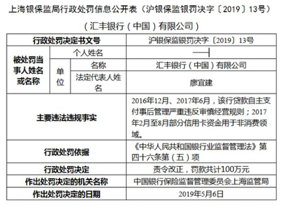 2019年5月,汇丰中国贷款自主支付事后管理严重违反审慎经营规则、部分信用卡资金用于非消费领域,遭罚100万元。