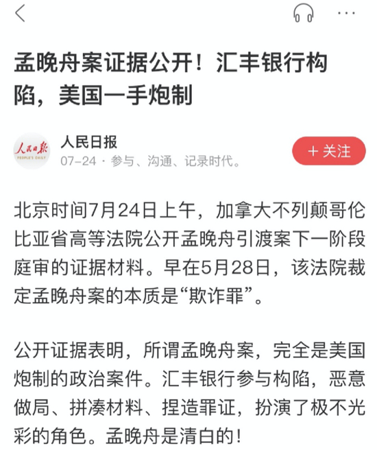 2020年7月24日,人民日报客户端发布《孟晚舟案证据公开!汇丰银行构陷,美国一手炮制》一文,揭露汇丰银行构陷华为细节。