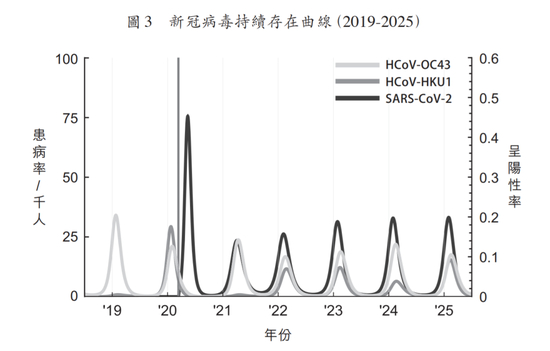 第一,正视人类对于新冠病毒的认知和对抗手段的有限性。在此次疫情开始的几个月里,即使资深的疾病专家也低估了这场疫情的严重性,以及演变成全球流行病的可能性。WHO 在推特(Twitter)上发表过‘没有明确证据表明新冠病毒人传人’的言论。之后的疫情发展证明,人类对于新冠病毒的专业知识和对抗手段相当有限,暴露了公共卫生资源的匮乏。以纳米作为尺度的病毒,几乎在人类构建的现代社会体系中通行无阻,导致人类付出数十万生命,数十万个家庭承受失去亲人的悲哀。现代科学与医学的发展速度,并不能跟上病毒发展与变异的速度。从新冠病毒的特性来看,人类在短时间内根本不可能将其彻底消灭。可以预料,无论是否能研发出疫苗,新冠病毒及其变异后代所造成的疫情很可能常态化,永远不会消失。在短暂压制住病毒之后,很大机会将会卷土重来,且每一年都会如约而至(所谓的‘后疫情时代’的提法或许是不成立的)。如果这样的假设成立,新冠病毒在2019 至2025 年区间所呈现的曲线将如下图所示(图3):