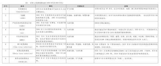 以下提供了二十世纪后半期至二十一世纪前二十年全球八种疫情从爆发到全球大流行的周期比较(表1):