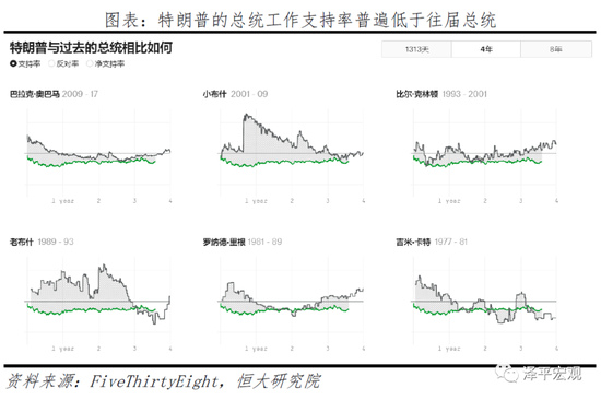 特朗普当前遭遇新冠肺炎疫情应对不力、疫情冲击下经济低迷、种族矛盾冲突加剧等困境,其总统工作支持率自3月底以来快速下滑。此外,特朗普的总统工作支持率显著差于往届总统,仅在近期好于卡特和老布什,而这两位恰好都未能连任。