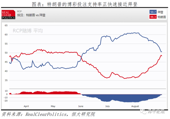 特朗普最大的优势在于他是现任总统。一方面,他能制定各种对内对外政策来吸引选民。例如,前段时间对中国频繁挑衅的强硬态度使其民调支持率自7月以来显著回升;从博彩投注情况来看,其支持率正快速接近拜登。另一方面,如果后续美国经济恢复,就业出现好转,特朗普也会将功劳揽到自己身上,以此获取选民支持。