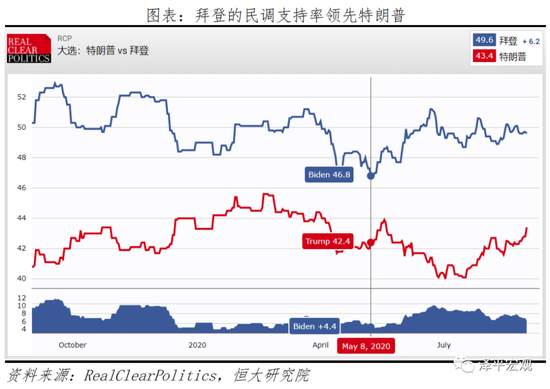 从目前的民调支持率来看,拜登暂时领先。拜登的支持率一直高于特朗普,5月以来优势进一步扩大,反映了民众对特朗普政府糟糕表现的不满。