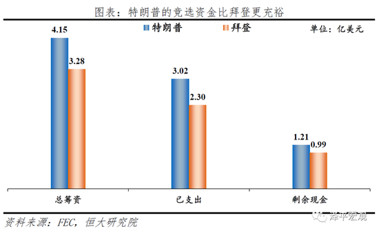 从竞选资金来看,特朗普目前领先。美国大选在一定程度上是金钱的较量,竞选资金越多,广告投放、竞选活动也就越多,吸引的选民也可能越多。根据美国联邦选举委员会(FEC)的数据,截至7月31日,特朗普共筹得竞选资金4.15亿美元,大于拜登的3.28亿美元。特朗普当前的竞选资金已高于2016年的3.51亿美元,且由于其现任总统的身份,在后续筹款上也具有很大优势。