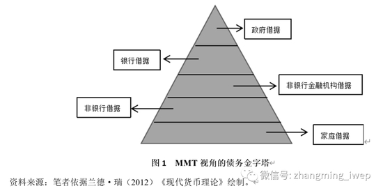 必须指出的是,MMT并不具有完整的货币政策分析框架,但是对于货币理论的三个基本问题,MMT给出了与主流货币理论泾渭分明的答案:首先,MMT指出货币即是债务,并提出金字塔式货币负债关系(图1):最底层以家庭借据为主,这些负债通常源自金融机构,并且使用金字塔更高一层的负债进行结算;由下向上的第二层为非银行借据,由从事生产的公司借据构成,多使用金融机构发行的负债进行结算;由下及上的第三层为非银行金融机构借据,使用更高一层的银行负债结算;位于顶端之下即为银行借据,通过政府负债净额结算;金字塔顶端为政府借据;其次,MMT回答了为什么需要货币,也即税收驱动货币。政府需要征税并发行货币,经济当事人需要通过主权货币纳税;再次,MMT从功能财政的视角出发来认识货币财政政策,认为公债是财富,政府负债决定非政府部门金融资产,政府支出决定经济总体收入。