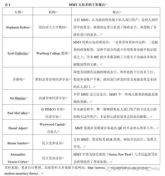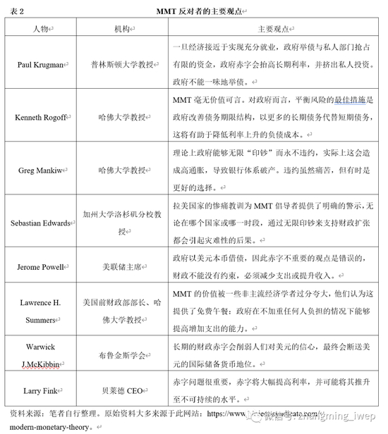 围绕MMT的争端之三是中央银行是否需要追求货币政策独立性。后凯恩斯主义经济学者及MMT支持者均认为,无论长期内还是短期内的货币政策均是非中性的,在最终经济目标的设定上,中央银行独立性都忽视了充分就业、价格稳定等多个政策目标之间的权衡取舍。MMT更是指出,在主权货币体系下,政府总是通过创造货币的方式进行支出,即使在央行完全独立于政府的前提下,财政政策依旧会对货币市场产生显著影响。国内演化经济学者贾根良等也是MMT的支持者,认为“中央银行货币政策独立性是个伪命题”。毫无疑问,上述主张遭到了来自主流经济学界的强烈反对。主流货币理论认为,中央银行独立性是现代货币制度发展的必然结果,中央银行与政府的职责目标互不相同、各有侧重,政府的首要目标是维持经济增长与稳定就业,而中央银行的首要目标则为维持本币币值的稳定。央行维持货币政策独立性,可以避免政府从中央银行获得融资,这能够对政府施加财政约束,从而避免政府通过创造货币的方式积累债务。近期关于MMT的新一轮争争论的焦点主要集中在上述前两个问题。有趣的是,目前支持MMT的知名人士主要集中于政界、商界与金融机构(表1),而MMT的主要反对者则集中于学界(表2)。我们在表1与表2中梳理了一些权威人士的代表性观点。