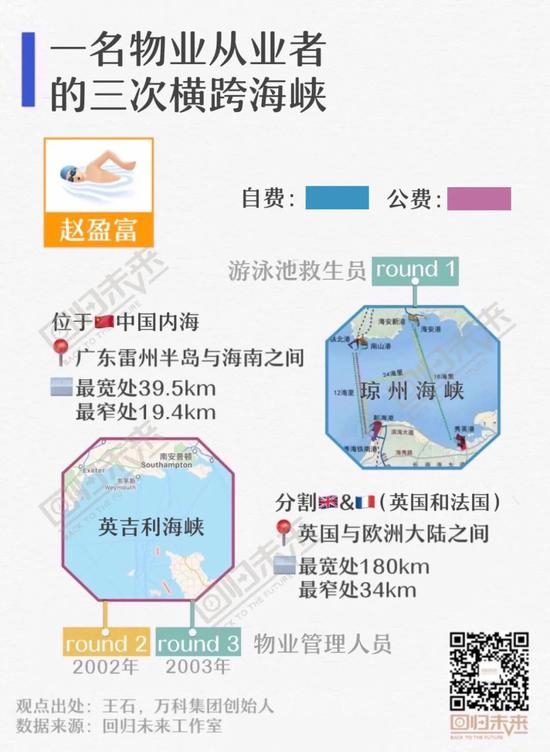 曾自费横跨琼州海峡的赵盈富,在万科公司支持下连续两次挑战,尝试横跨英吉利海峡。