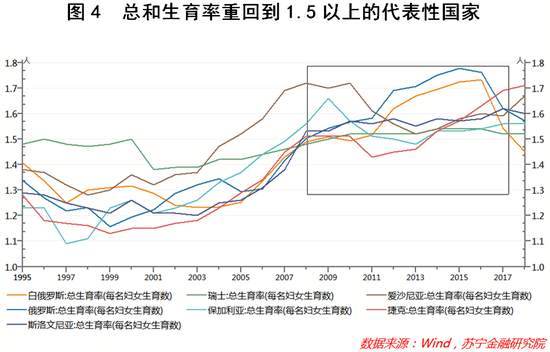 尽管该理论问世伊始,曾引发了不少国家极大的不安甚至是恐慌,但仅仅过了三年时间,俄罗斯的总和生育率就由2005年的1.29回升至2008年的1.5,此后多年更是长期保持在1.6~1.8的区间内。不仅如此,自2008年前后,白俄罗斯、瑞士、爱沙尼亚、保加利亚、捷克、斯洛文尼亚等多个欧洲国家的总和生育率都回到了1.5以上(见图4),从数据上看,这些国家已然摆脱了“低生育率陷阱”的困扰。